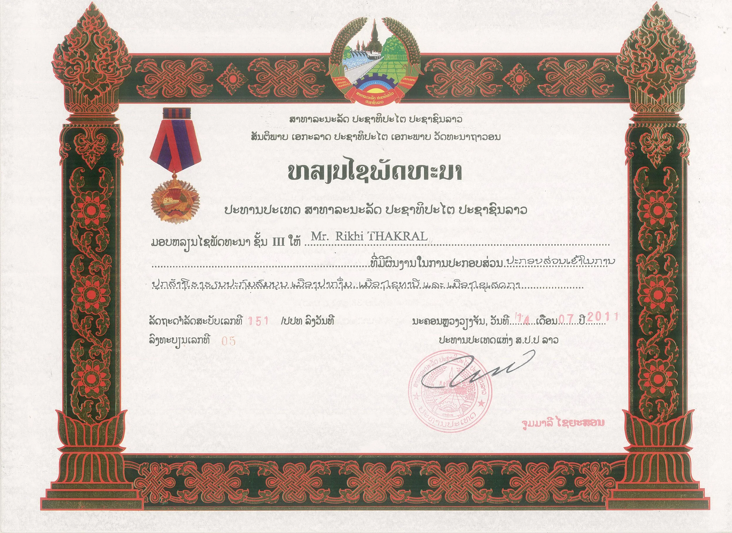 Awarded by H.E. Bounnhang Vorachith, The President of the Lao People’s Democratic Republic