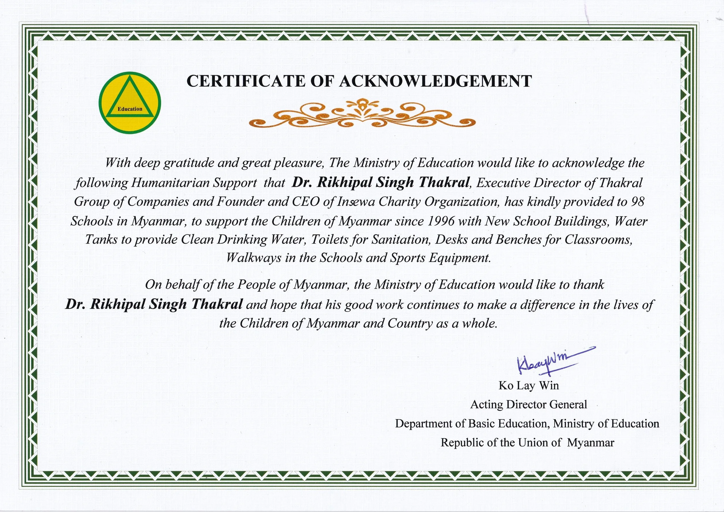 For the humanitarian support provided since 1996 to 98 Schools in Myanmar,with New School Buildings, Water Tanks, Toilets, Desks and Benches
